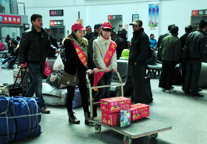 來自揚(yáng)汽集團(tuán)和團(tuán)市委組織的志愿者們有的在進(jìn)站口向旅客指引車站售票、候車等各個功能區(qū)位置;有的在服務(wù)臺回答旅客咨詢;有的在安檢處勸導(dǎo)旅客把攜帶的物品放上危險品檢查儀安檢;有的推著“雷鋒車”幫行李較多的旅客拖運(yùn)箱包;有的給候車的旅客倒上一杯熱水;有的在檢票口幫助維持現(xiàn)場秩序,避免發(fā)生擁堵;還有的在候車大廳勸導(dǎo)旅客請勿吸煙……