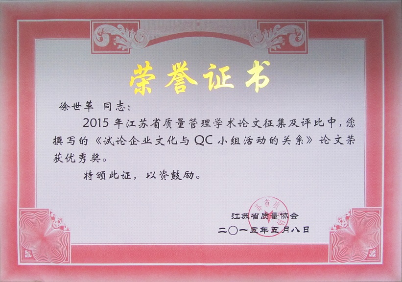 由江蘇省質(zhì)量協(xié)會舉辦的2014年江蘇質(zhì)量管理學(xué)術(shù)論文征集評選活動落下帷幕,5月8日在南京華江賓館召開了江蘇質(zhì)量管理學(xué)術(shù)論文表彰暨交流會,江蘇省質(zhì)量技術(shù)監(jiān)督局副局長張前、質(zhì)量處處長兼省質(zhì)量協(xié)會副秘書長祁寧清、省質(zhì)量協(xié)會會長耿寧等及獲獎作者參加了會議。集團公司徐世革同志的《試論企業(yè)文化與QC小組活動的關(guān)系》榮獲優(yōu)秀獎。