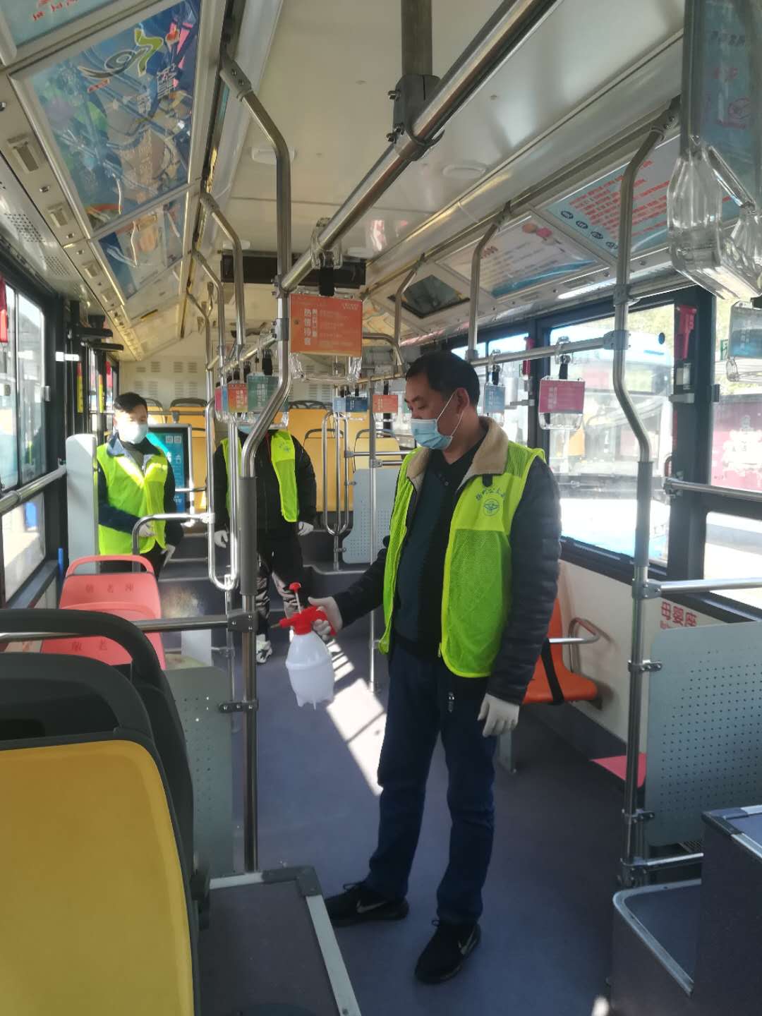崗前培訓(xùn)后,志愿者們分工明確,在公交站的志愿者們拎著手持噴壺對(duì)待恢復(fù)營(yíng)運(yùn)線路車輛的地面、扶手、座位進(jìn)行消毒工作,確保做到不留死角;在車站的志愿者們,協(xié)助車站工作人員做好旅客引導(dǎo)工作,測(cè)量體溫、以及掃碼登記等。