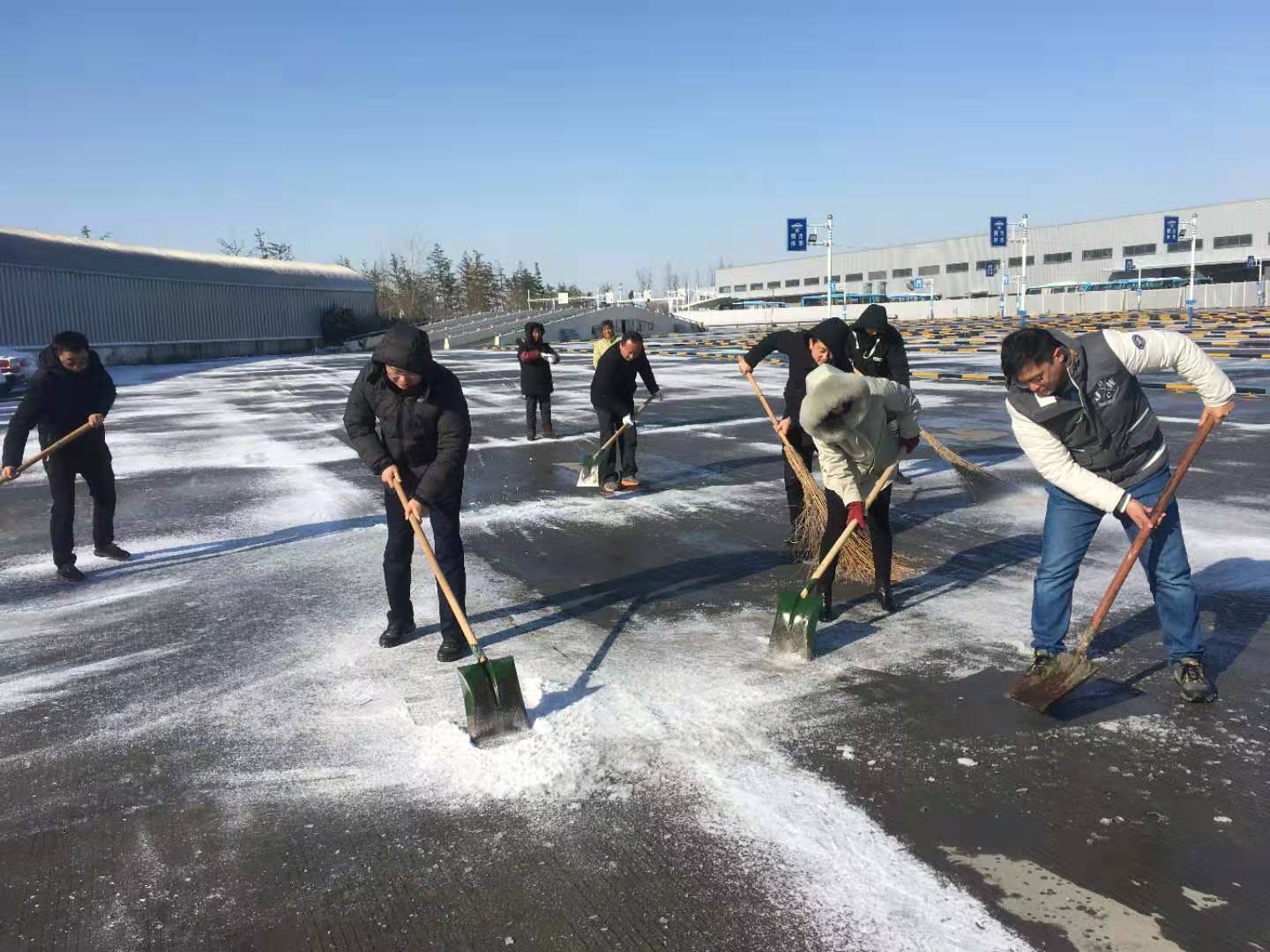 12月30日早上各黨支部積極響應(yīng)集團(tuán)黨委號(hào)召,組織黨員干部、管理人員協(xié)助車站清理積雪,在站前廣場(chǎng)、發(fā)車平臺(tái),進(jìn)出站口等重點(diǎn)部位,大家拿著掃把、草墊、鐵鍬、雪鏟,充分發(fā)揮團(tuán)隊(duì)協(xié)作精神,干勁十足,一派熱火朝天景象,為班線開通做好后勤保障。