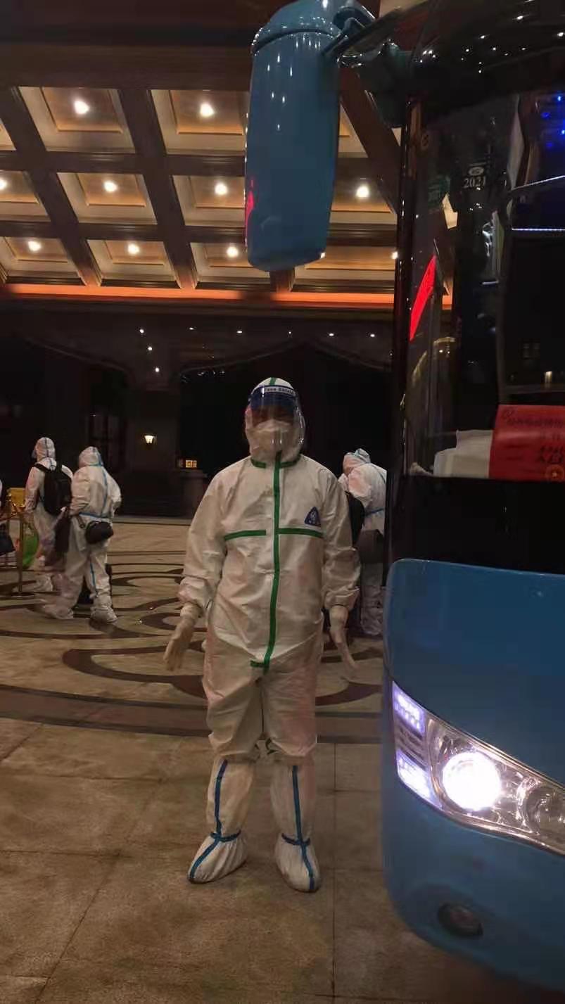 由于南京的疫情有所好轉(zhuǎn),家鄉(xiāng)揚(yáng)州的疫情又突發(fā),7月31日接到通知返回?fù)P州繼續(xù)“作戰(zhàn)”;氐綋P(yáng)州后到疾控中心做完核酸檢測(cè)一切正常,并前往酒店進(jìn)行隔離,準(zhǔn)備全身心投入后續(xù)轉(zhuǎn)運(yùn)工作。每當(dāng)執(zhí)行轉(zhuǎn)運(yùn)任務(wù)時(shí),穿著防護(hù)服、戴著護(hù)目鏡開車,對(duì)有豐富駕駛經(jīng)驗(yàn)的他來(lái)說(shuō),仍是一個(gè)不小的挑戰(zhàn),全身被包裹得密不透氣,行動(dòng)十分不方便,必須高度集中精神,小心駕駛確保行車安全。談及轉(zhuǎn)運(yùn)工作,魏建也記不清轉(zhuǎn)運(yùn)了多少趟隔離人員了,反正每趟任務(wù)都安全保質(zhì)保量的完成了。