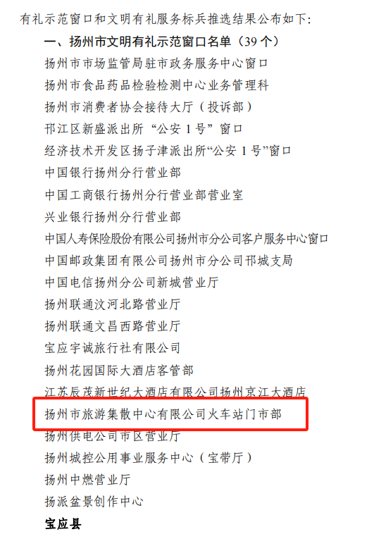 揚(yáng)州旅游集散中心火車站門市部榮獲市“2023年度文明有禮示范窗口”榮譽(yù)稱號