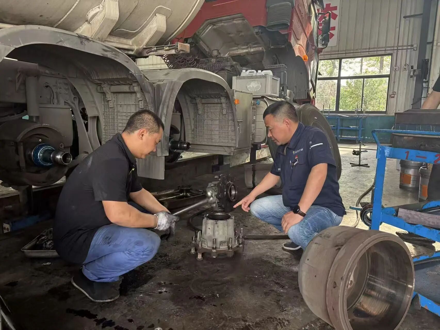 說(shuō)話間,一輛“疑難車”駛?cè)霃S區(qū)。駕駛員反映車輛底盤異響嚴(yán)重,伴有灼燒味。熊俊與同事立即上前,共同試車排查。最終,他們發(fā)現(xiàn)是制動(dòng)鼓因散熱不足導(dǎo)致變形摩擦。確定維修方案后,團(tuán)隊(duì)迅速更換配件,僅用兩小時(shí)就排除了故障。事后回訪時(shí),駕駛員連連稱贊:“這下可以安心跑國(guó)慶班次了!”